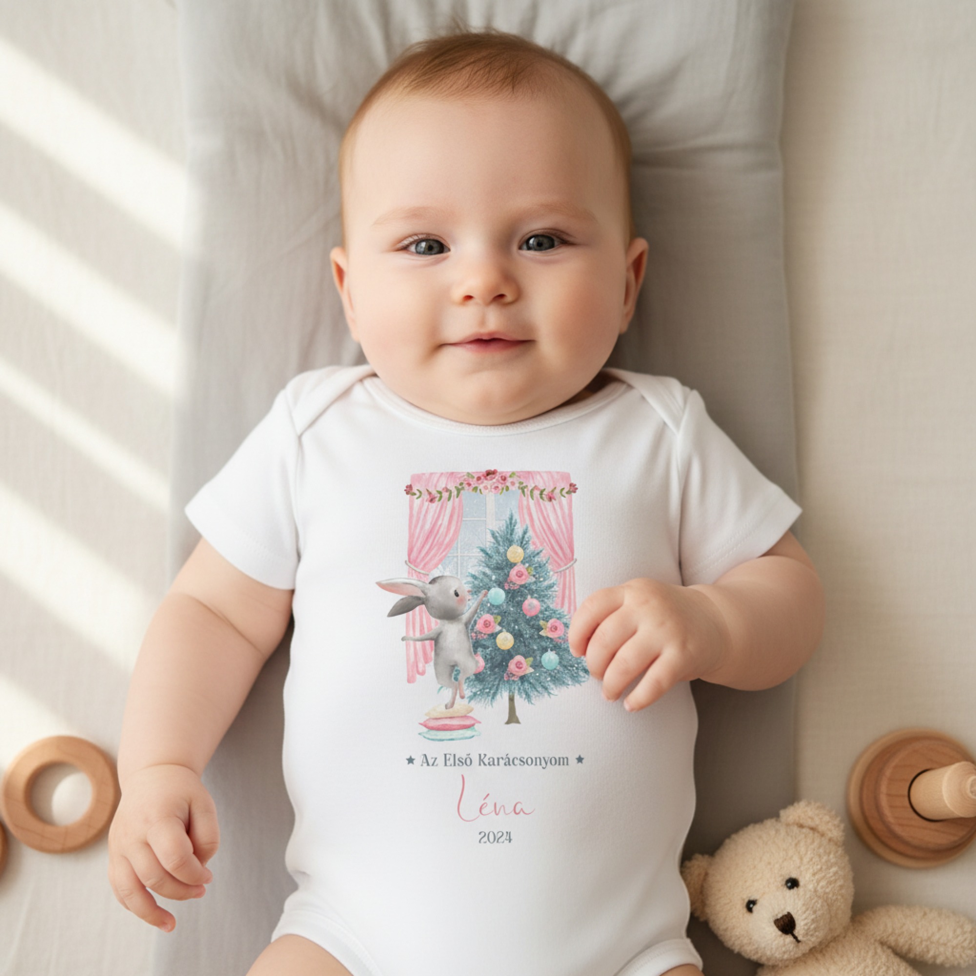 Az első karácsonyom gyerek body, saját névvel, évszámmal, fát díszítő nyuszival