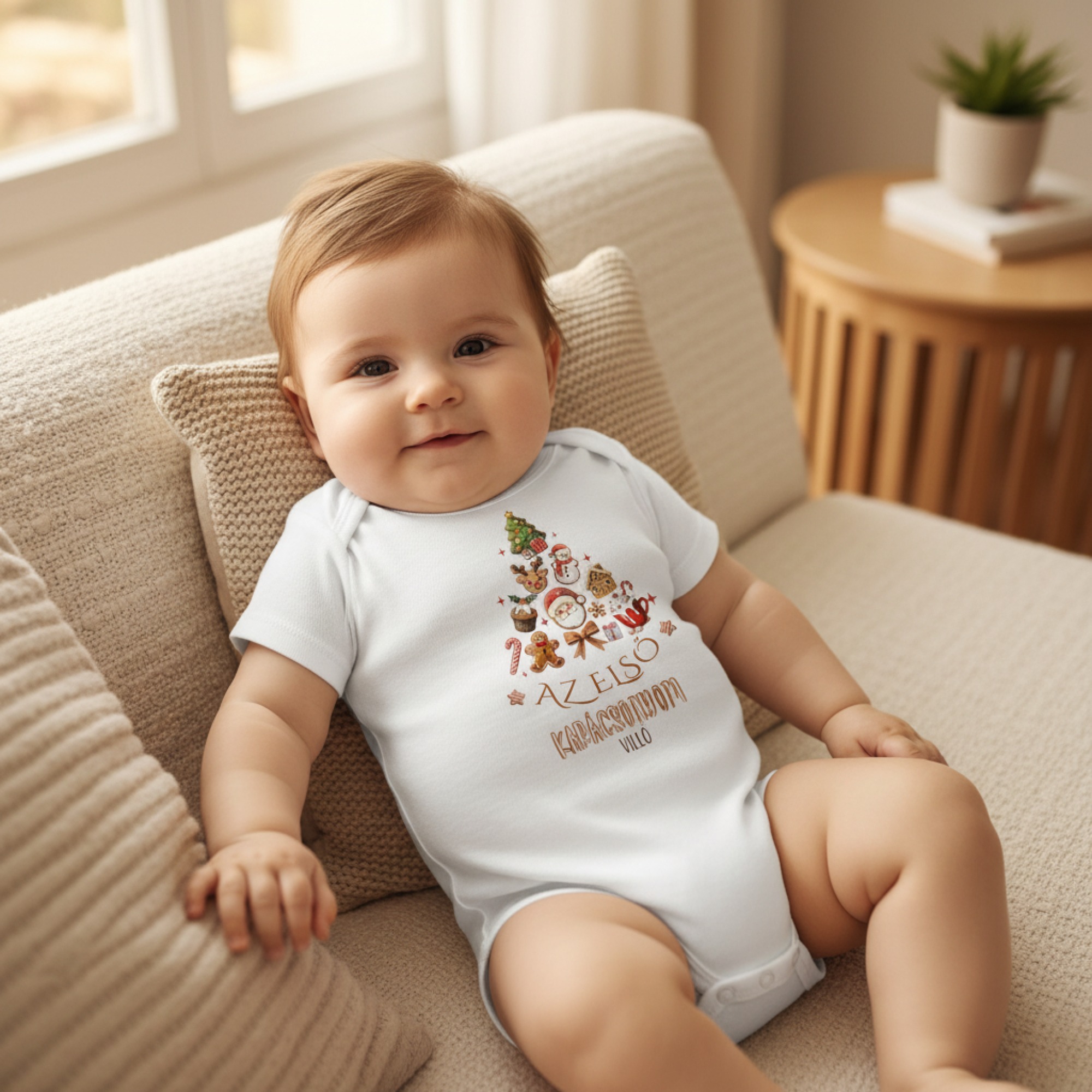 Az első karácsonyom gyerek body, saját névvel, karácsonyi mintákkal, karácsonyfa alakban