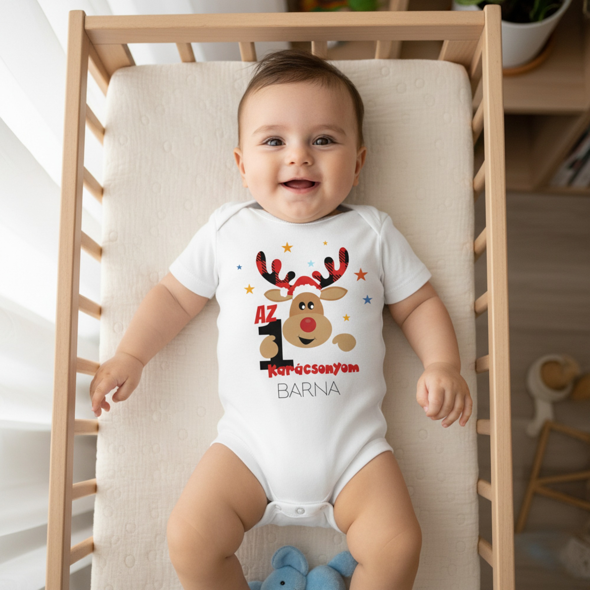 Az első karácsonyom gyerek body, saját névvel, szarvas mintával