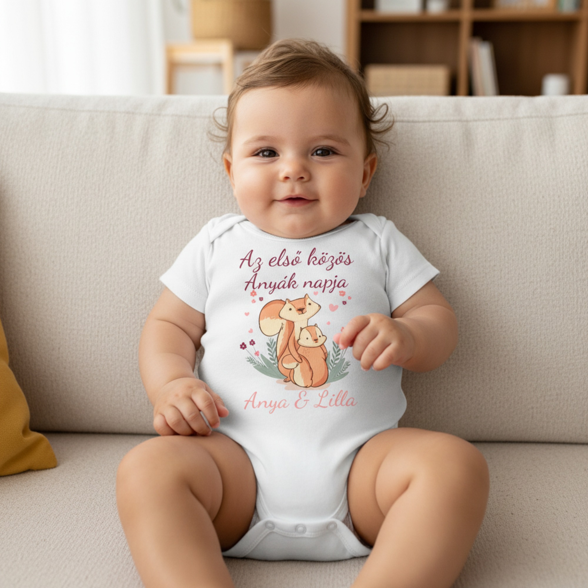 Az első közös anyák napja, mókusos mintával gyerek body