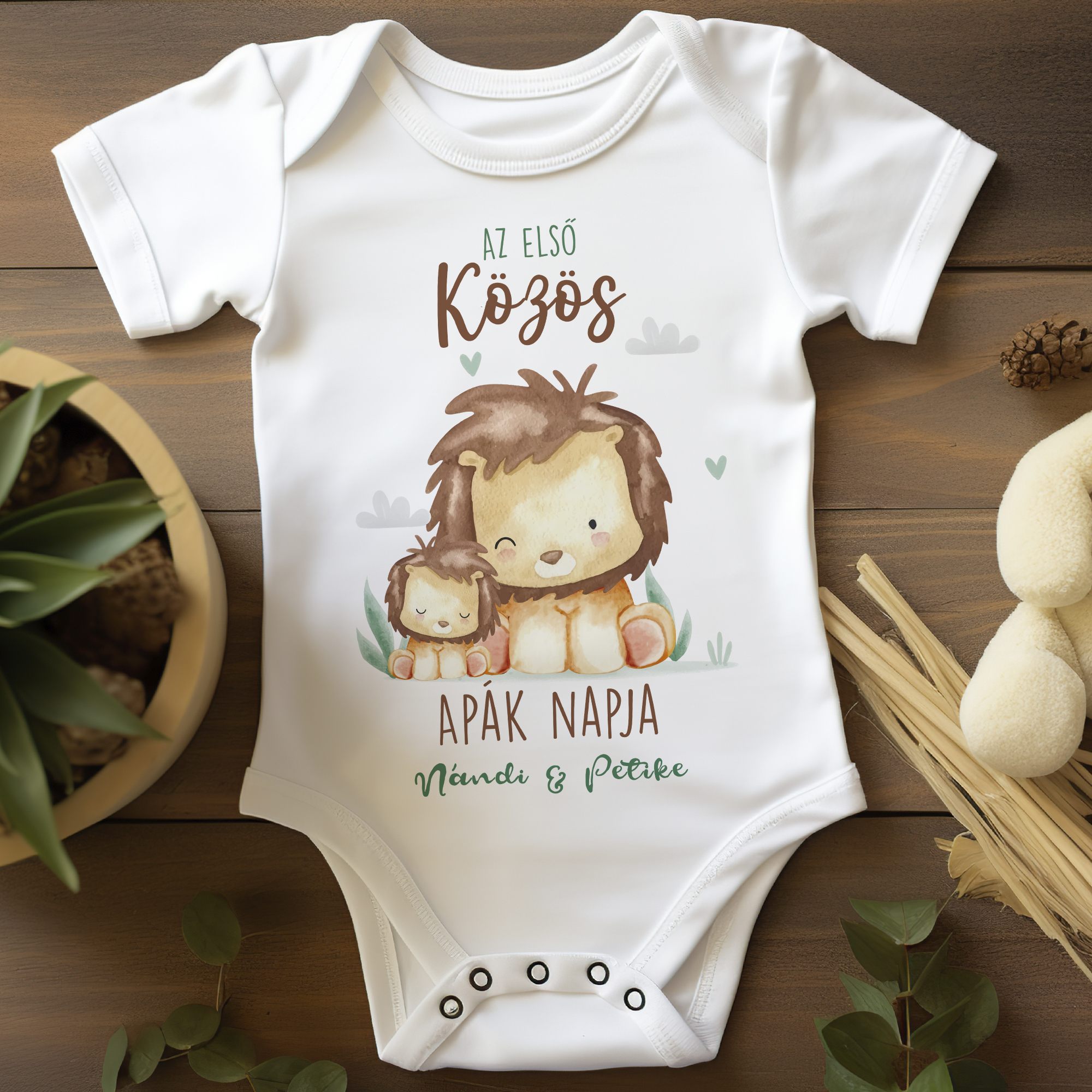 Az első közös apák napja gyerek body, ülő oroszlánokkal, nevekkel