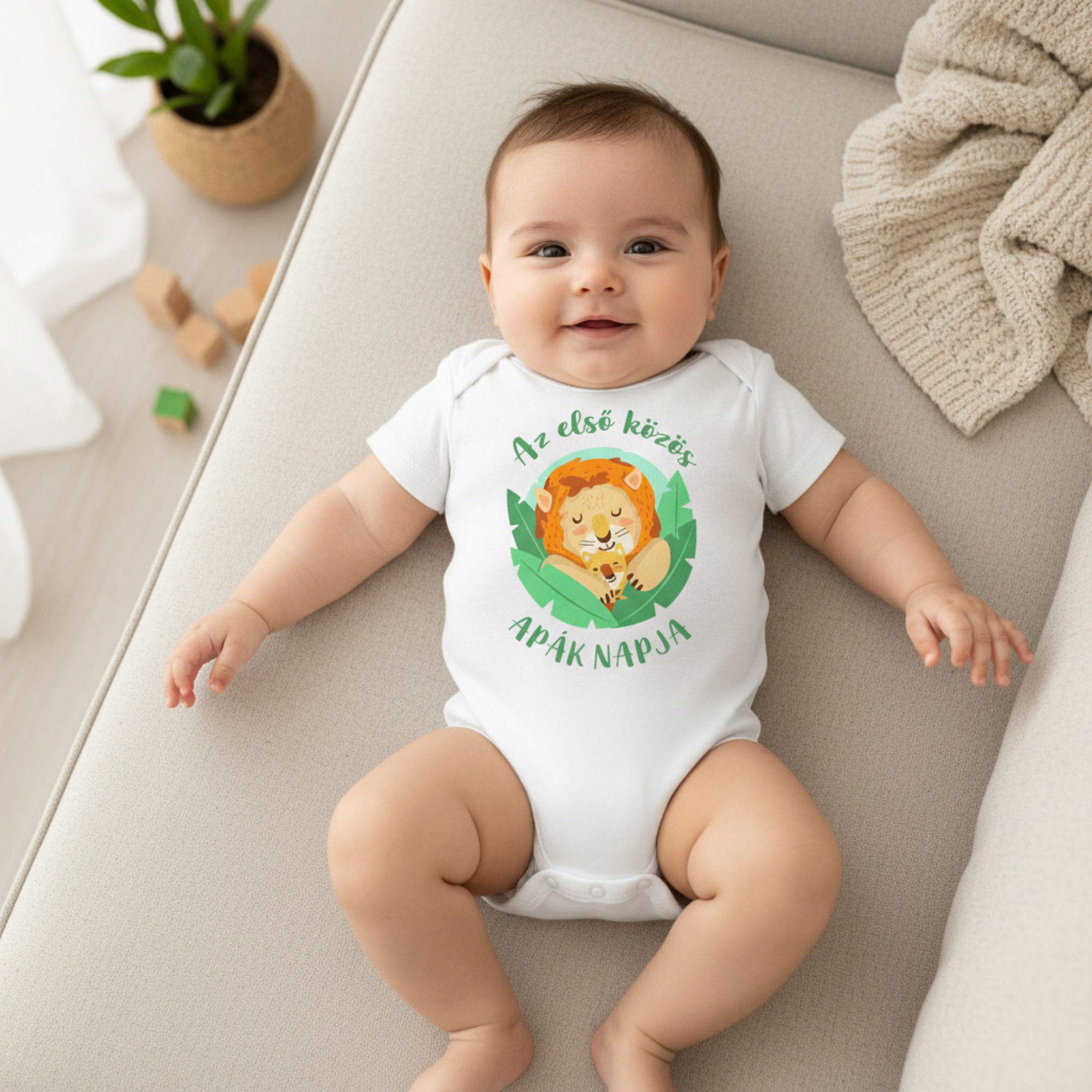 Az első közös apák napja, oroszlánokkal, levelek között gyerek body