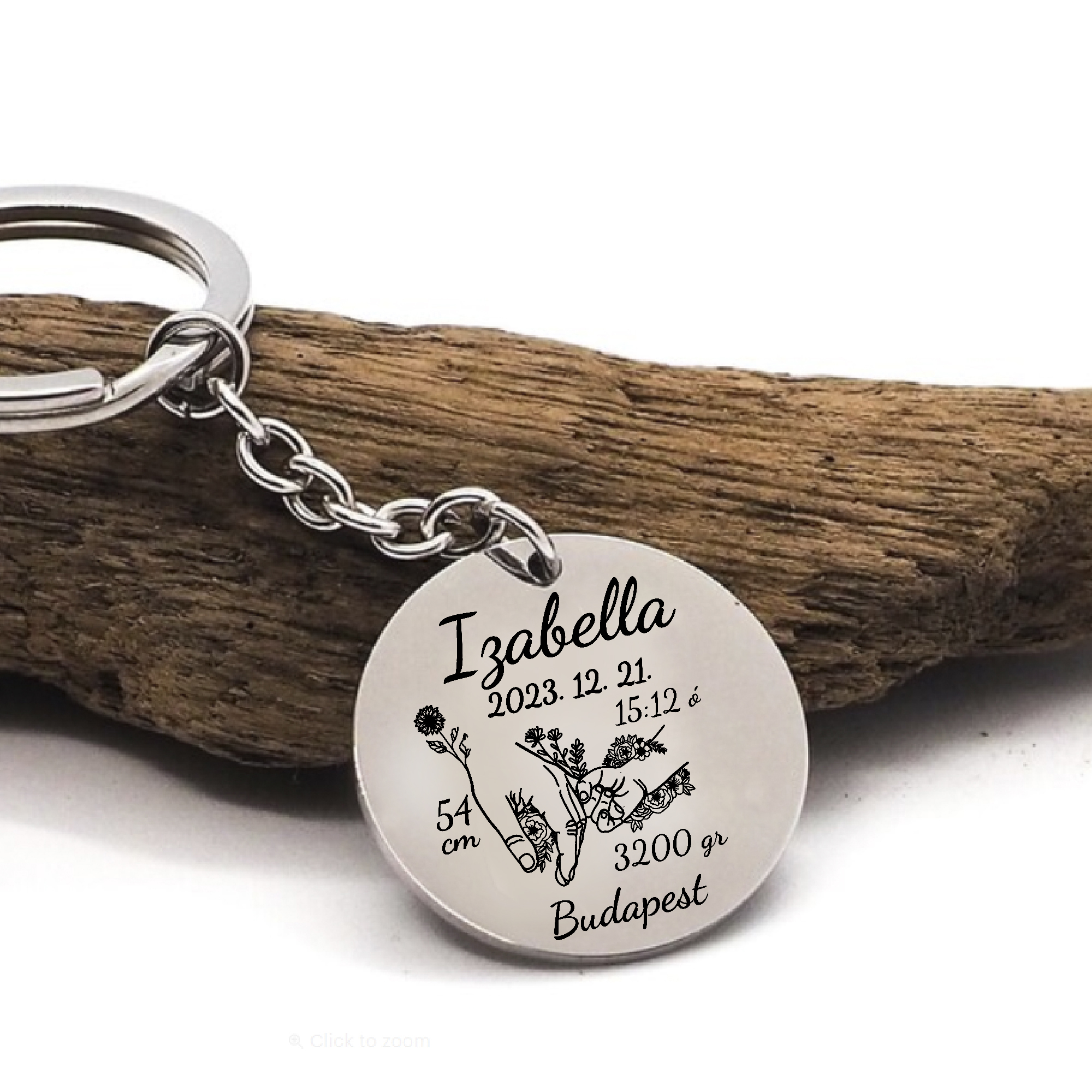 A kulcstartó 35 mm átmérőjű, prémium rozsdamentes acél anyagú, egyedi gravírozással készül.