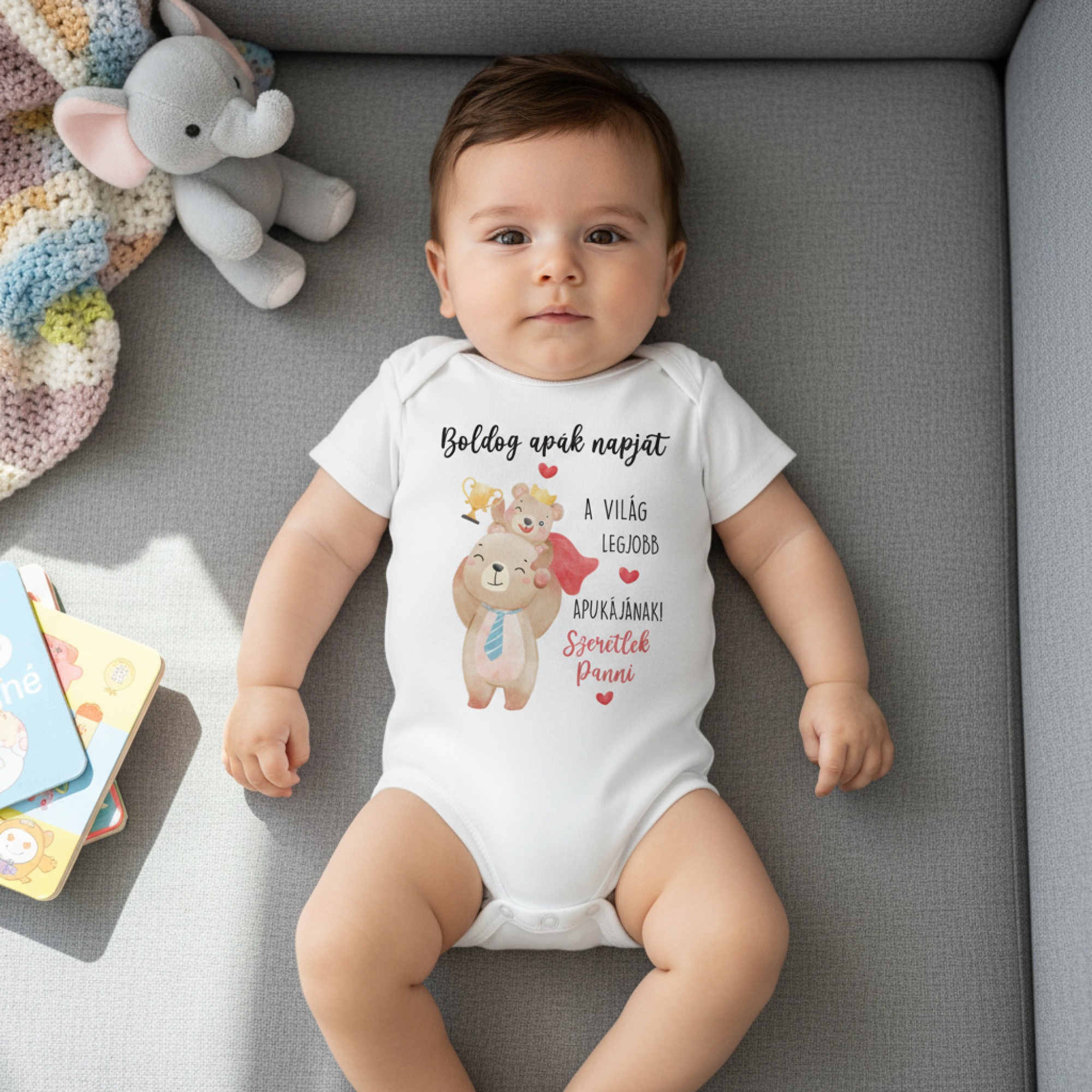 Boldog apák napját gyerek body, apa és lánya macikkal, névvel