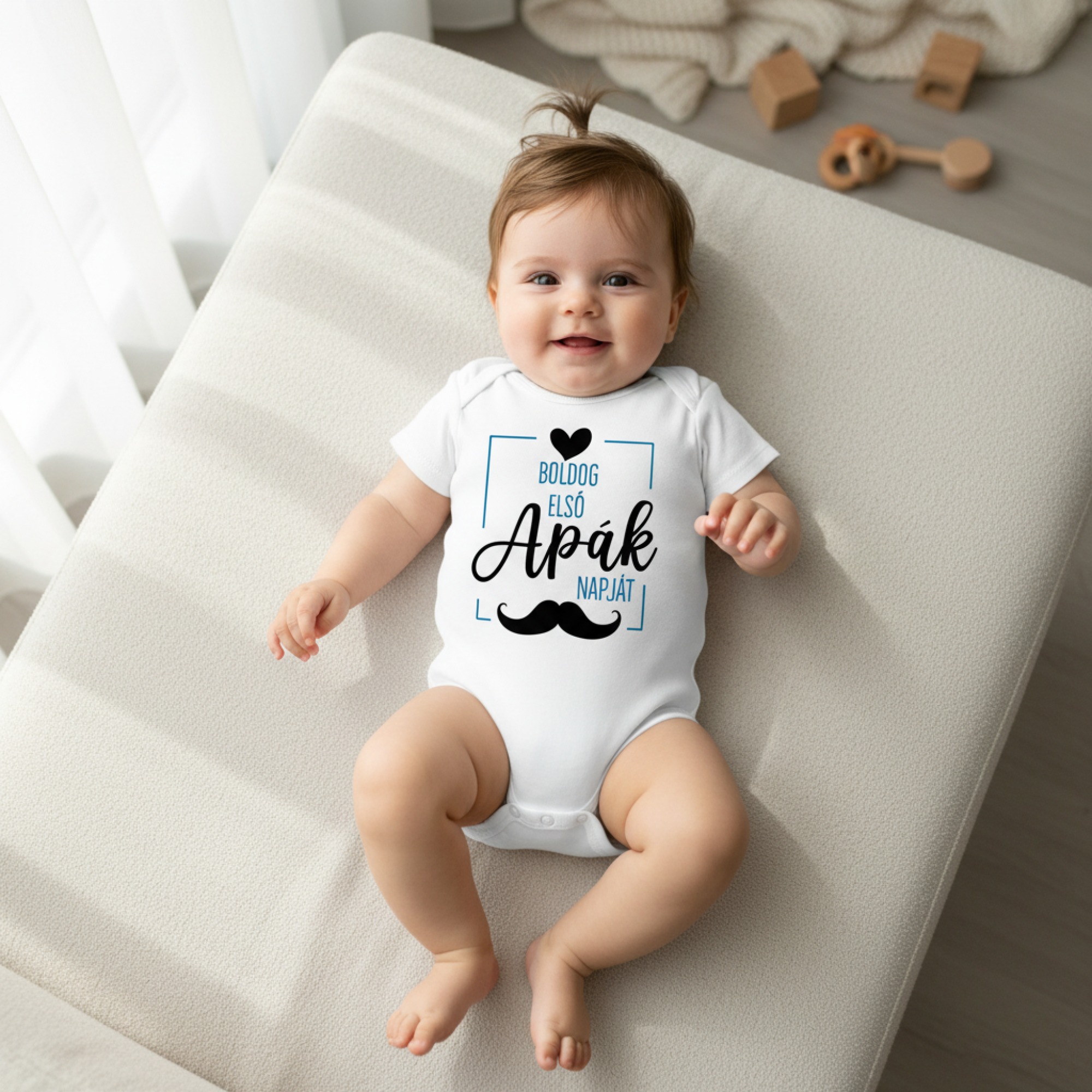 Boldog Első Apák Napját gyerek body, kék és fekete szöveggel