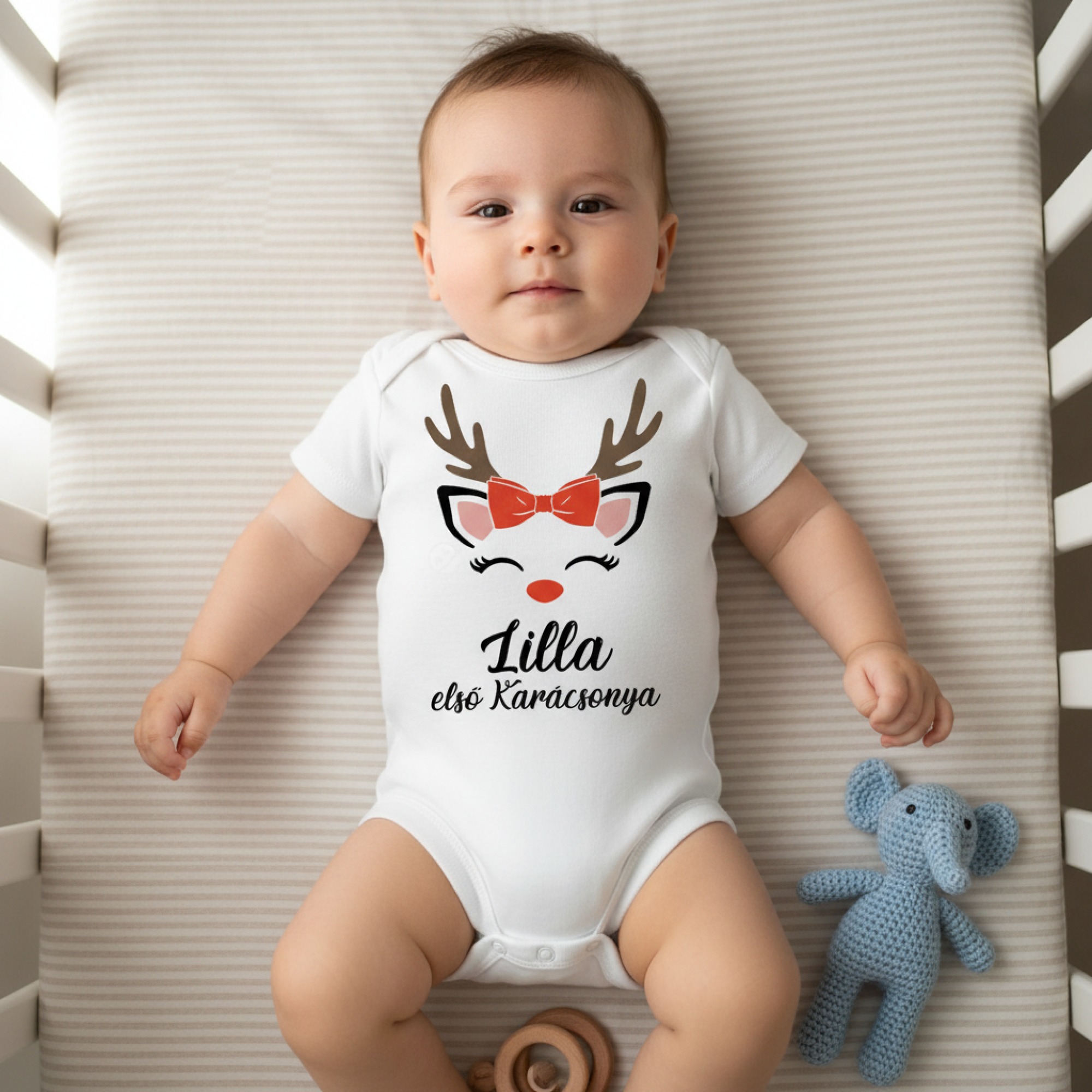 … első karácsonya őzikés gyerek body, névvel