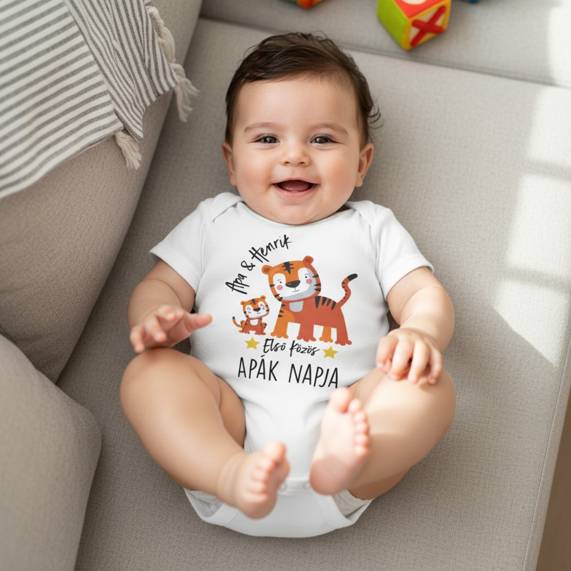 Első közös Apák napja, cuki tigrisekkel, névvel gyerek body