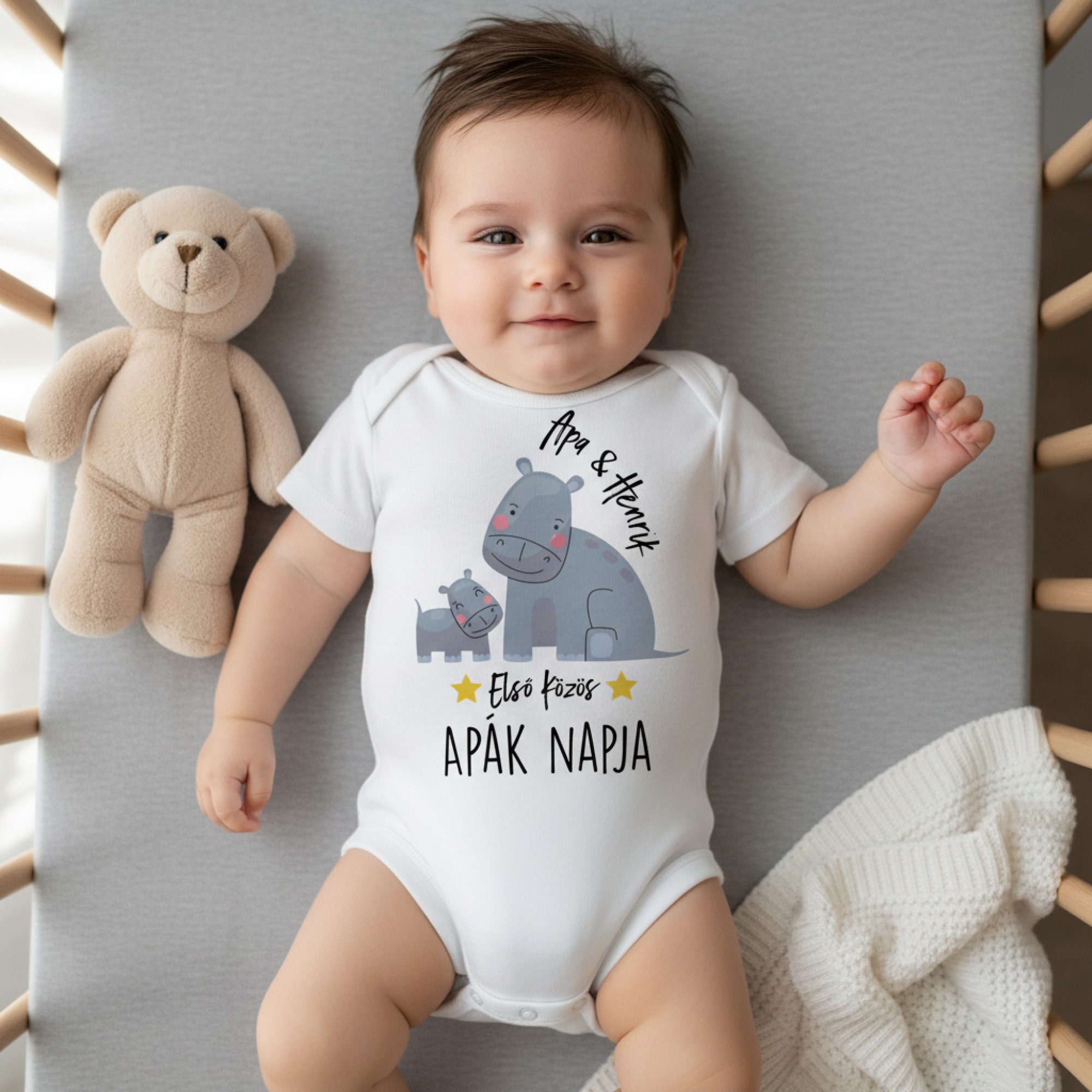 Első közös Apák napja, cuki vízilovakkal, névvel gyerek body