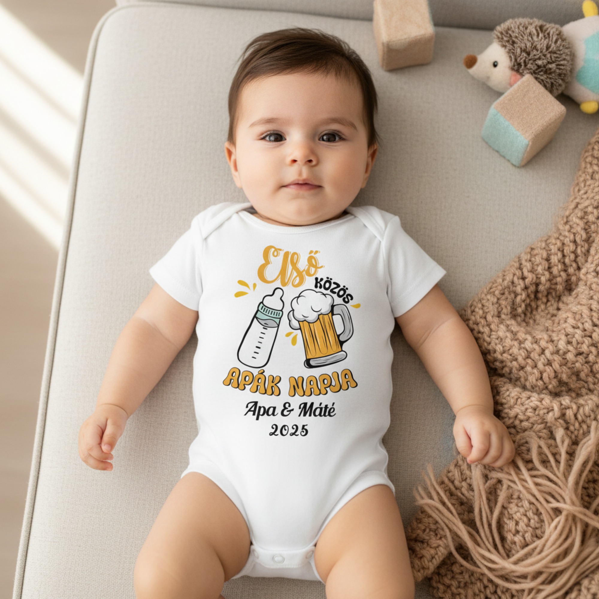 Első közös apák napja, koccintós gyerek body, névvel, évszámmal