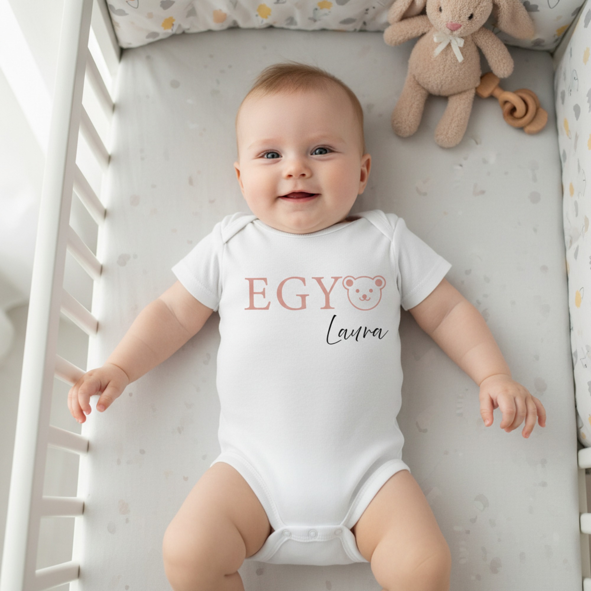 Első szülinapos gyerek body, rózsaszín felirattal, macival, saját névvel