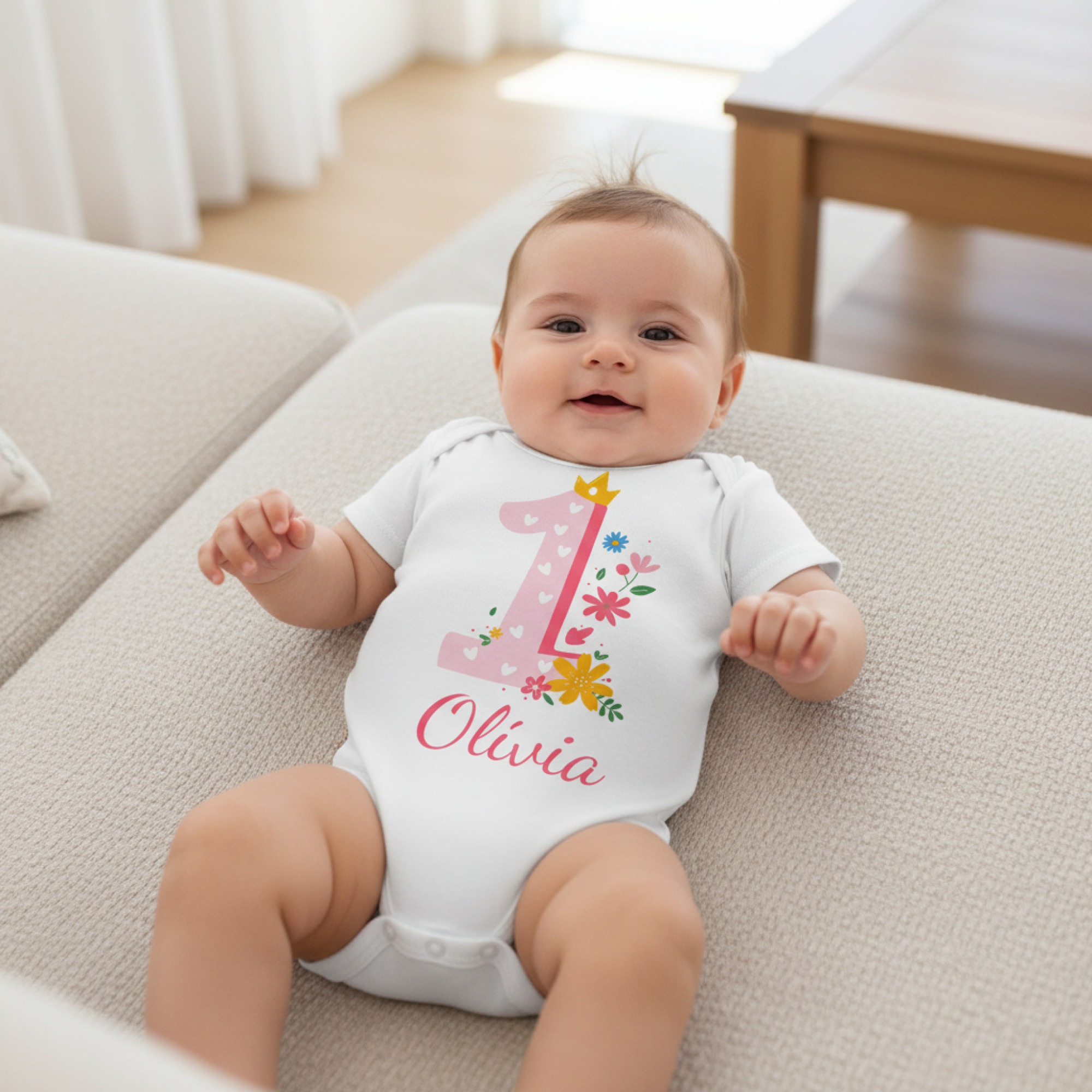 Első szülinapos gyerek body, rózsaszín számmal, virágokkal, saját névvel