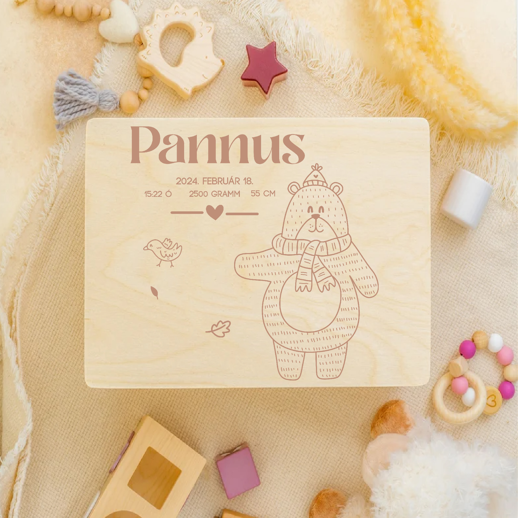 Emlékőrző fadoboz, névvel, adatokkal, macival