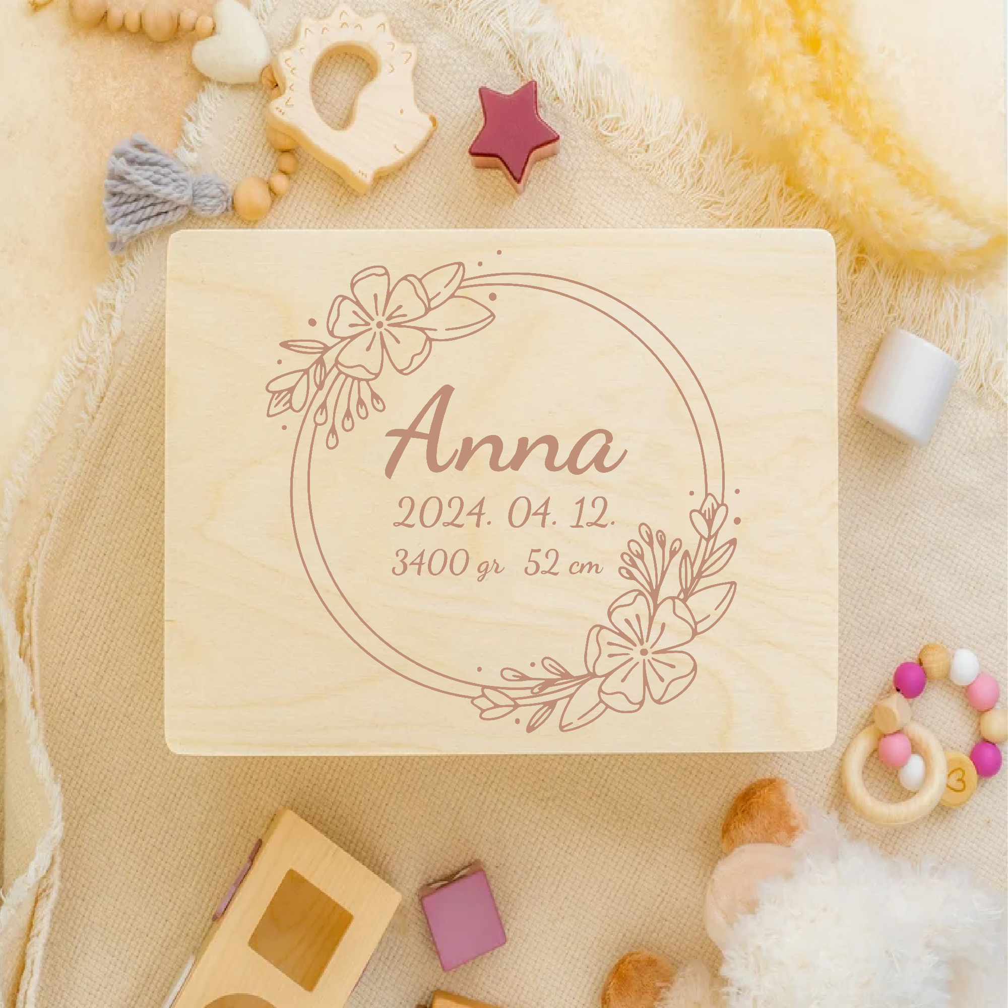Emlékőrző fadoboz, névvel, adatokkal, virágos gyűrűben