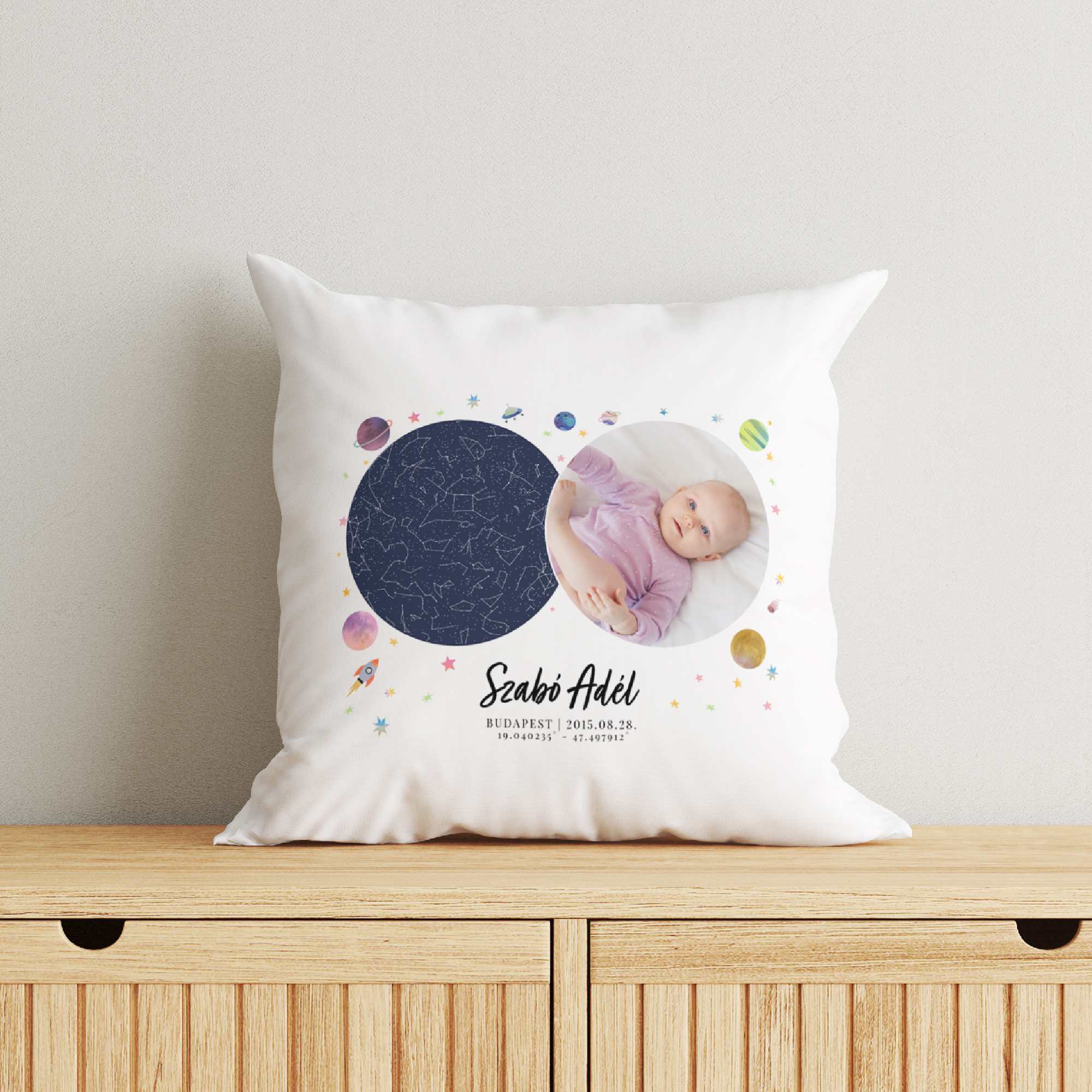 Fényképes kék csillagtérképes párna, bolygókkal
