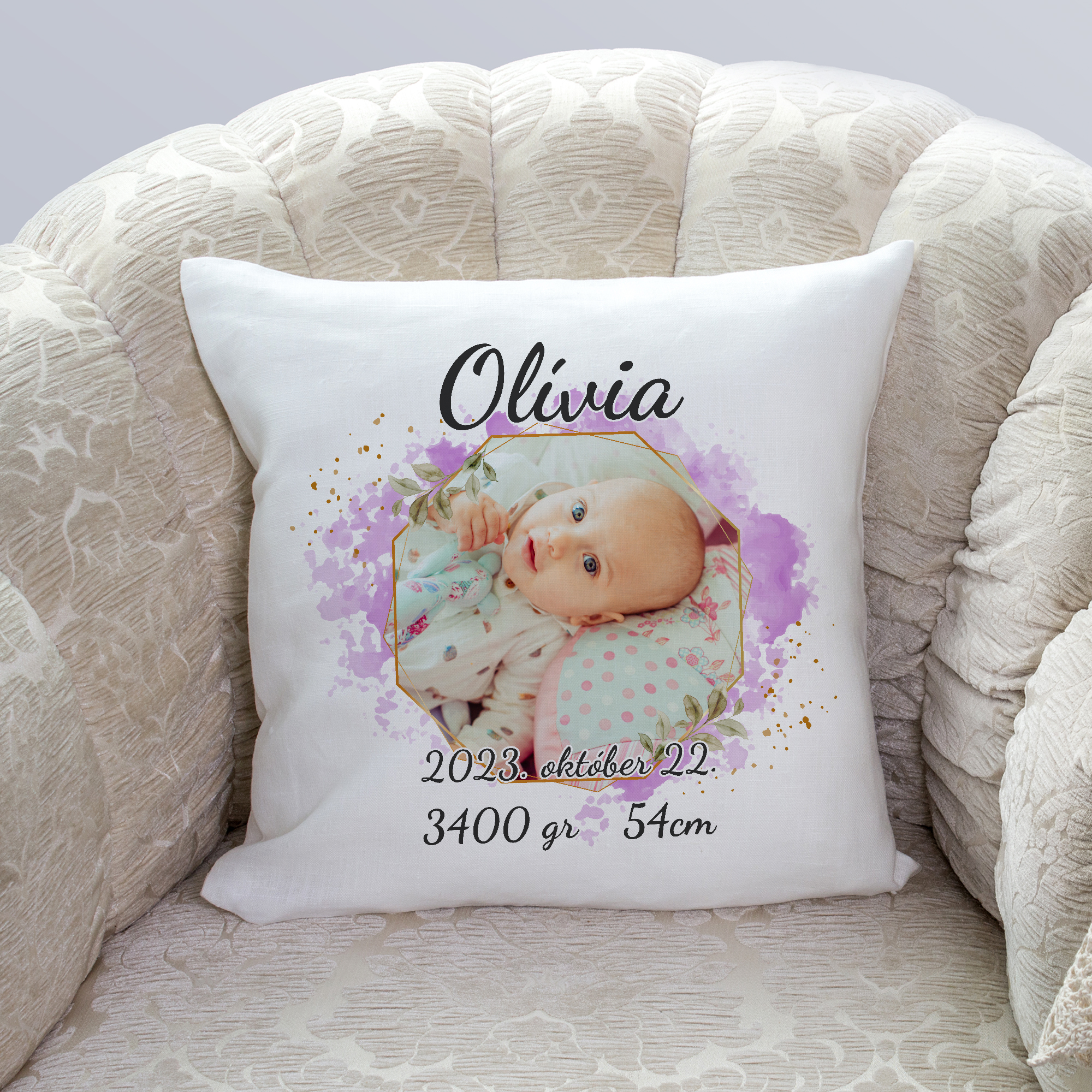 Fényképes párna, gyermek nevével, születési adataival, nyolcszögletű formával