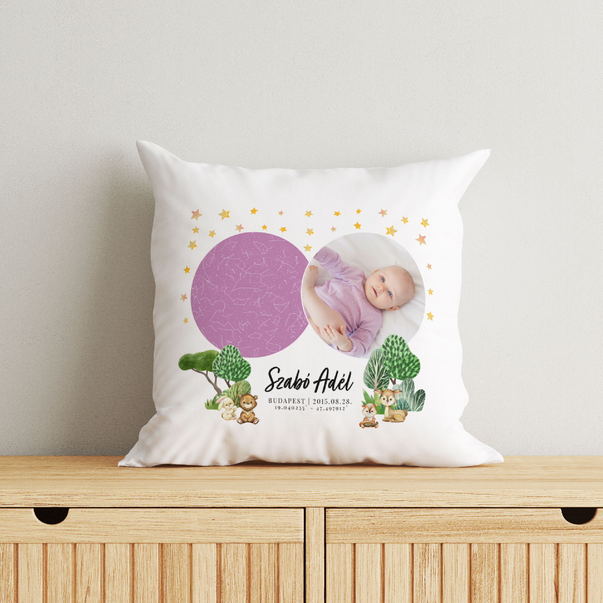 Fényképes rózsaszín csillagtérképes párna, erdei állatokkal