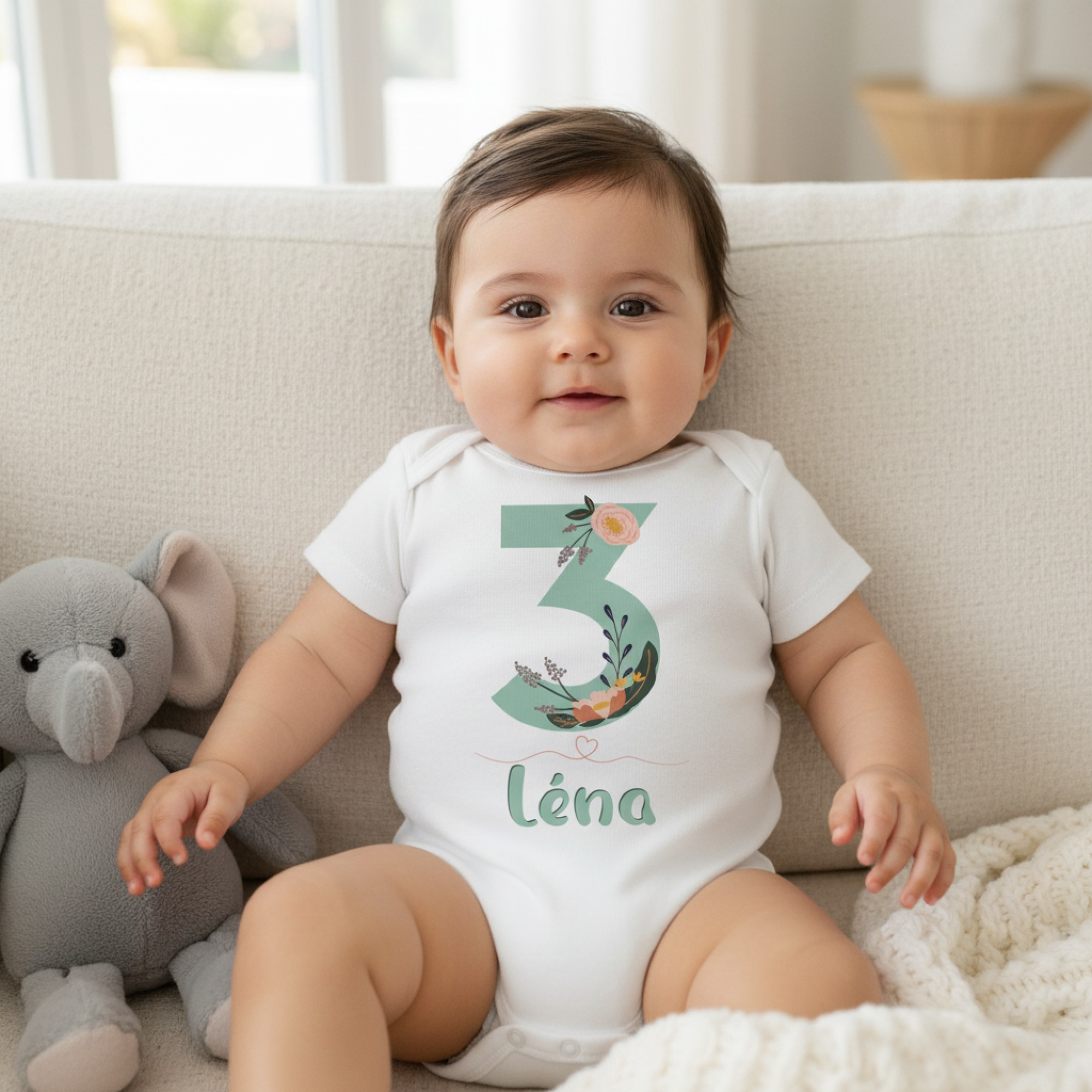 Harmadik szülinapos gyerek body mezei virágokkal, névvel