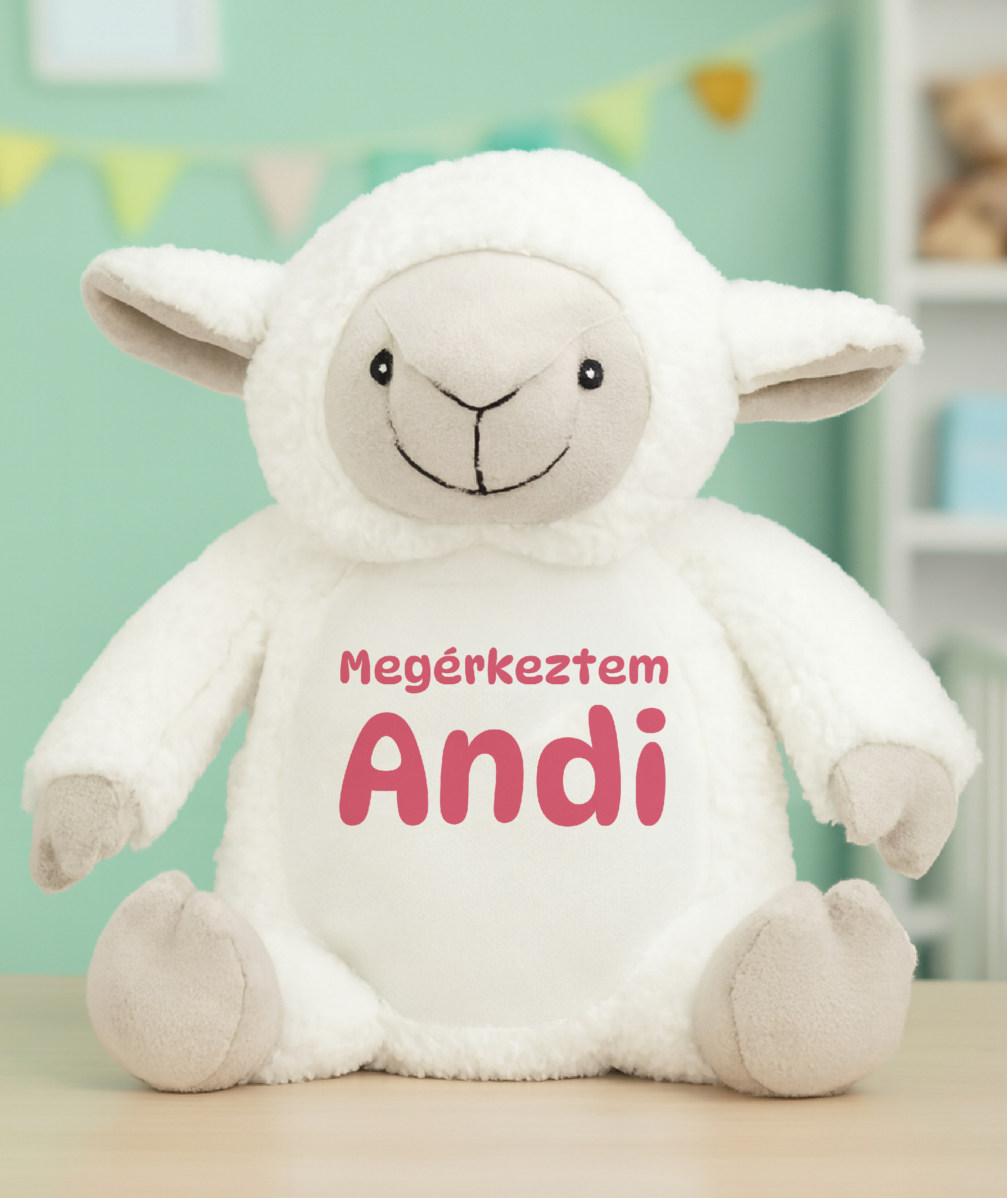 Megérkeztem névre szóló plüss bárány, választható színű szöveggel