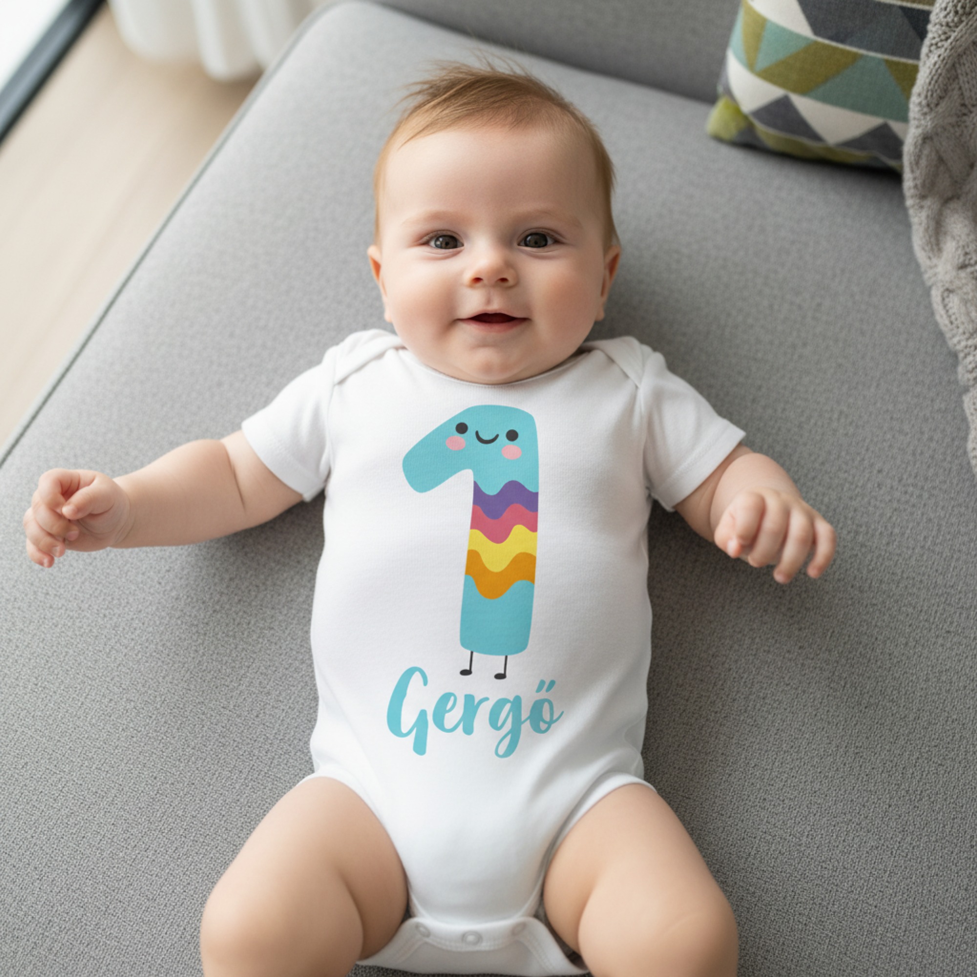 Mosolygó kék első szülinapos gyerek body, saját névvel