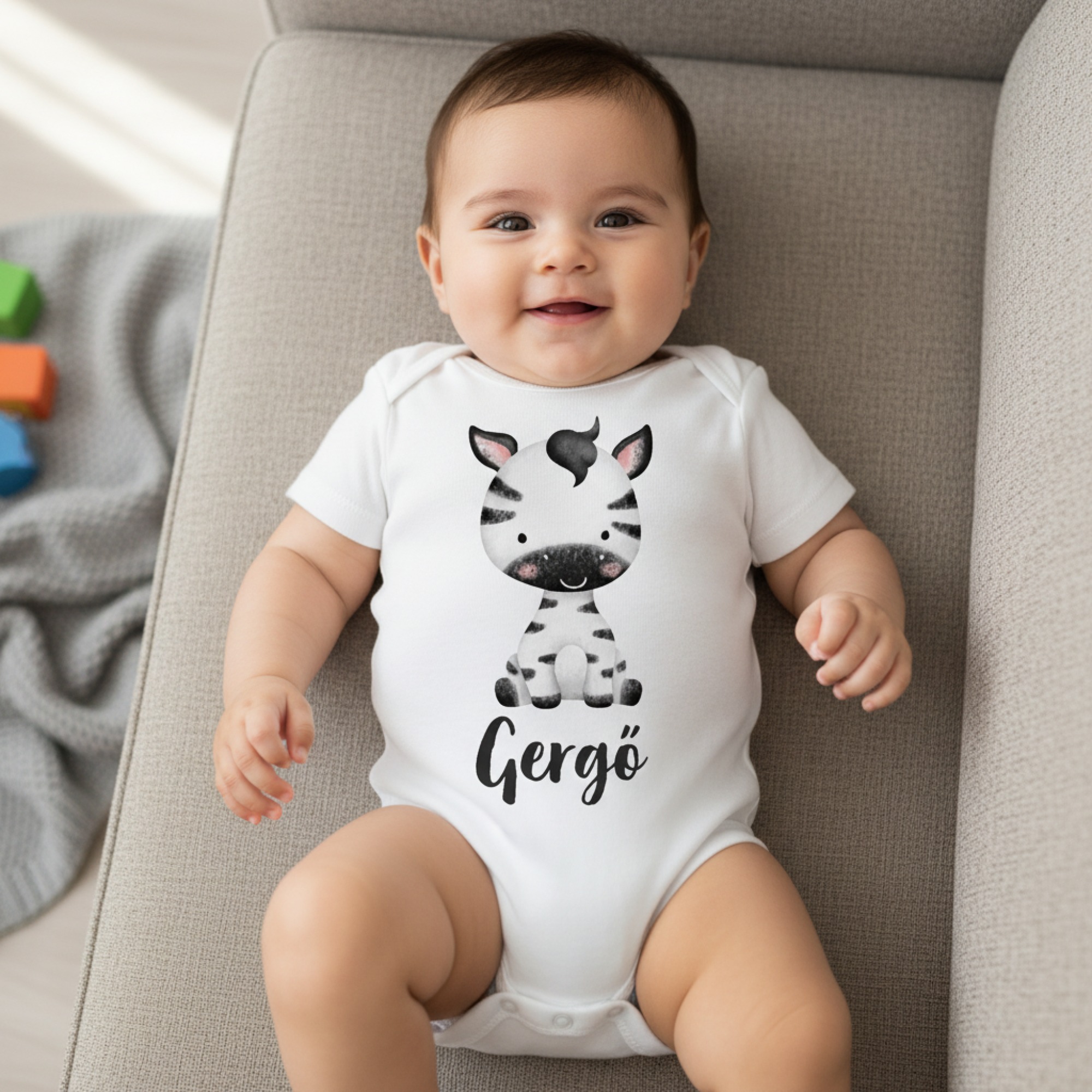Mosolygó zebrás gyerek body saját névvel