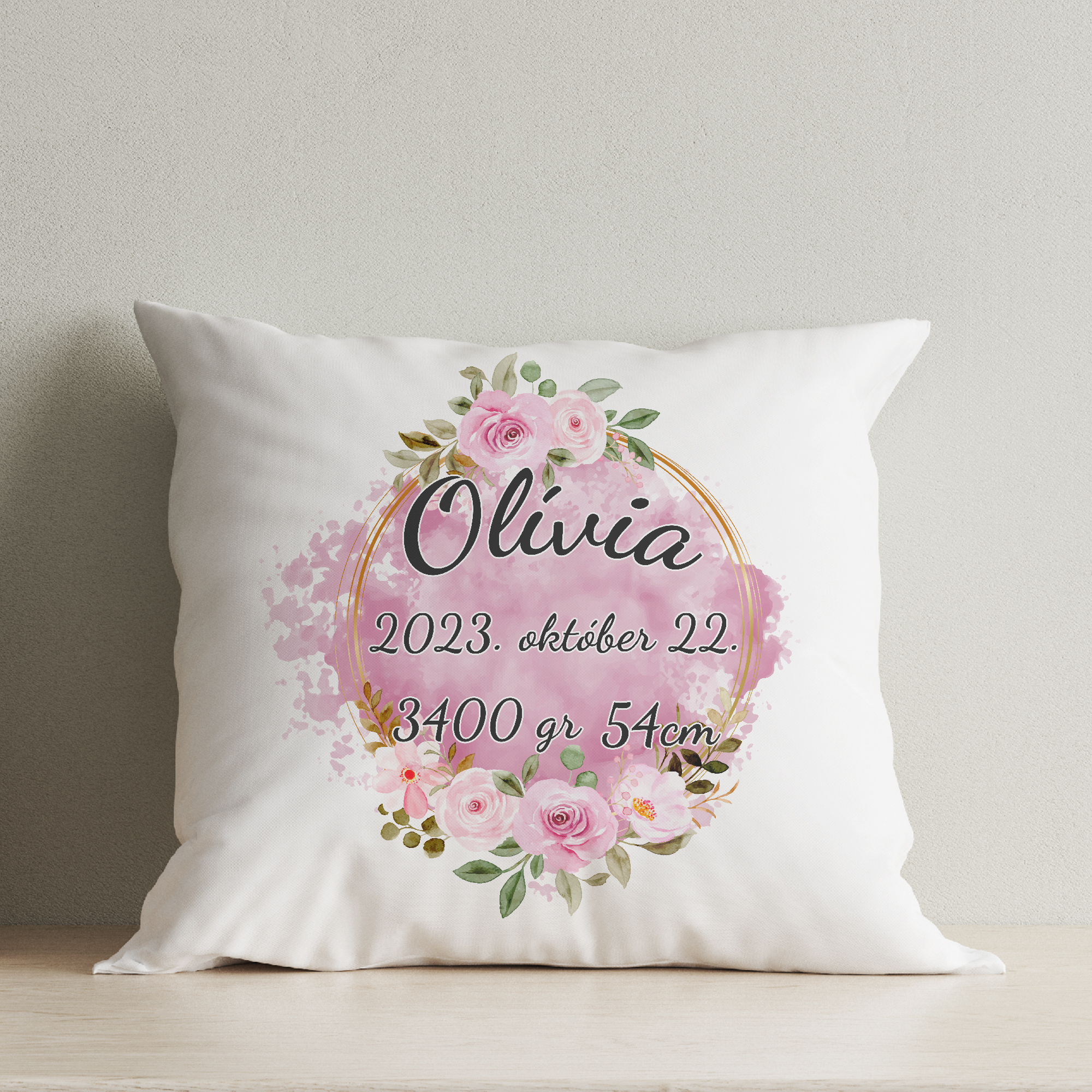 Neves párna, gyermek születési adataival, rózsaszín hatású koszorú mintával