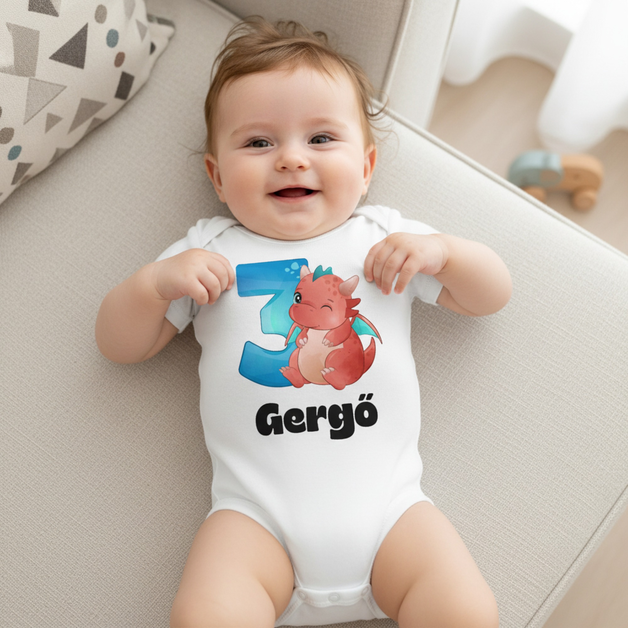 Piros dínós harmadik szülinapos gyerek body saját névvel