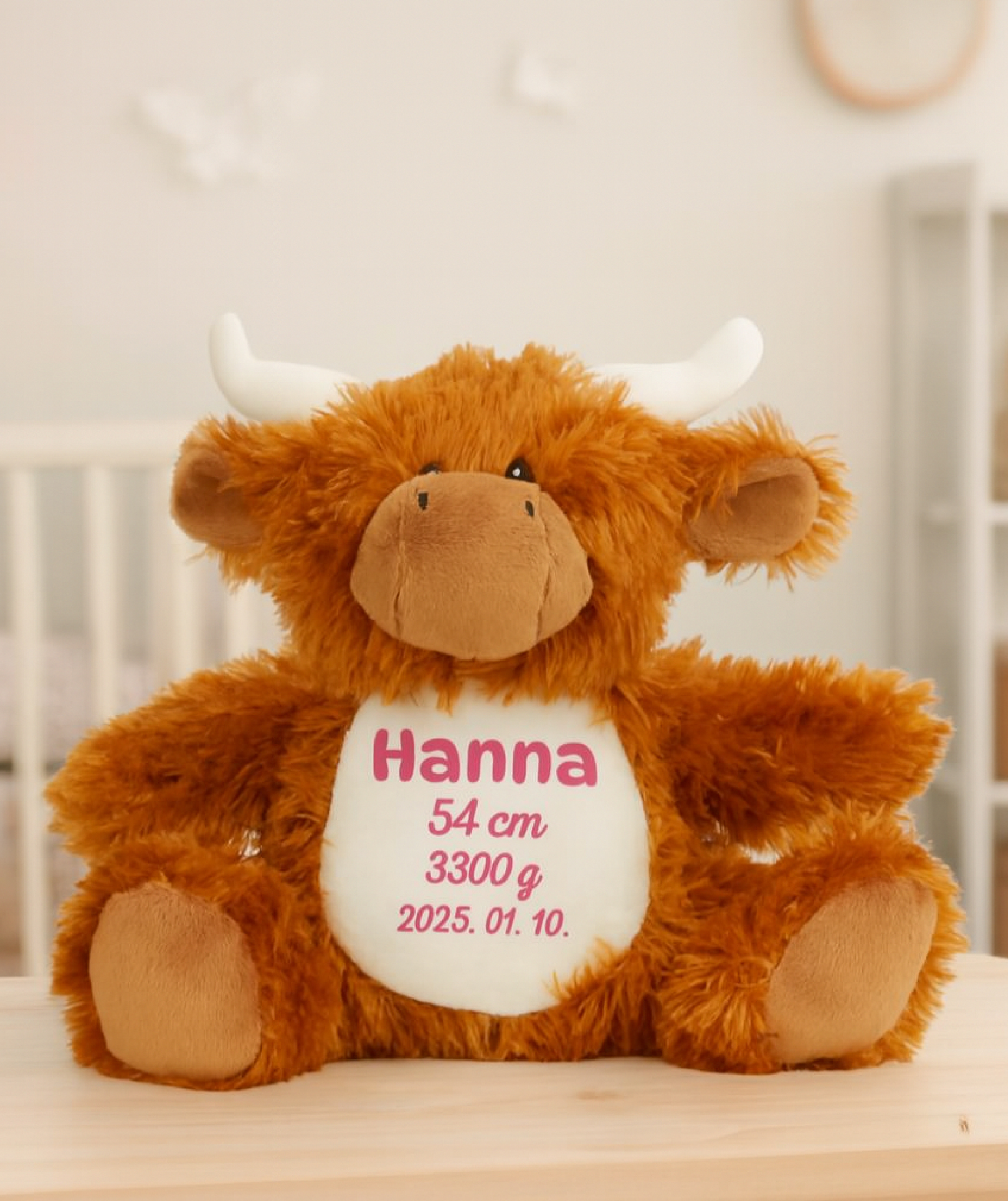 Plüss felföldi marha, névvel, születési adatokkal, választható színű szöveggel