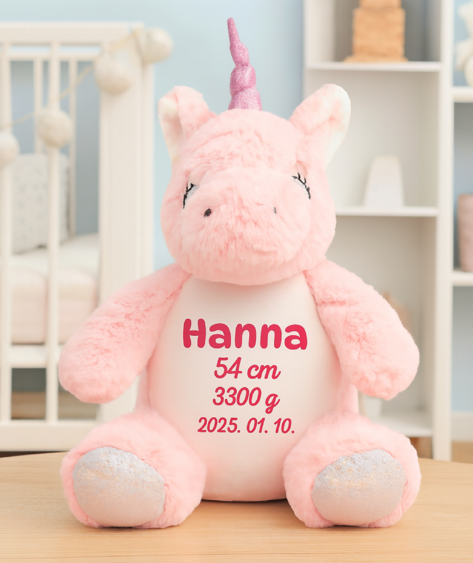 Plüss unikornis, névvel, születési adatokkal, választható színű szöveggel