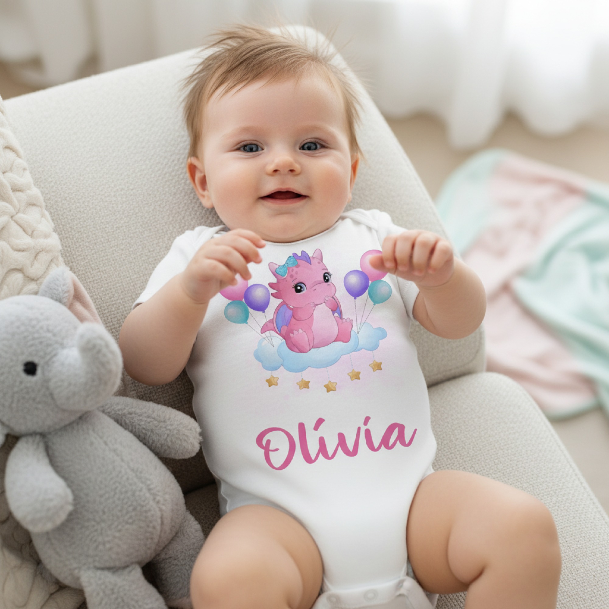 Rózsaszín dínó lufikkal gyerek body saját névvel