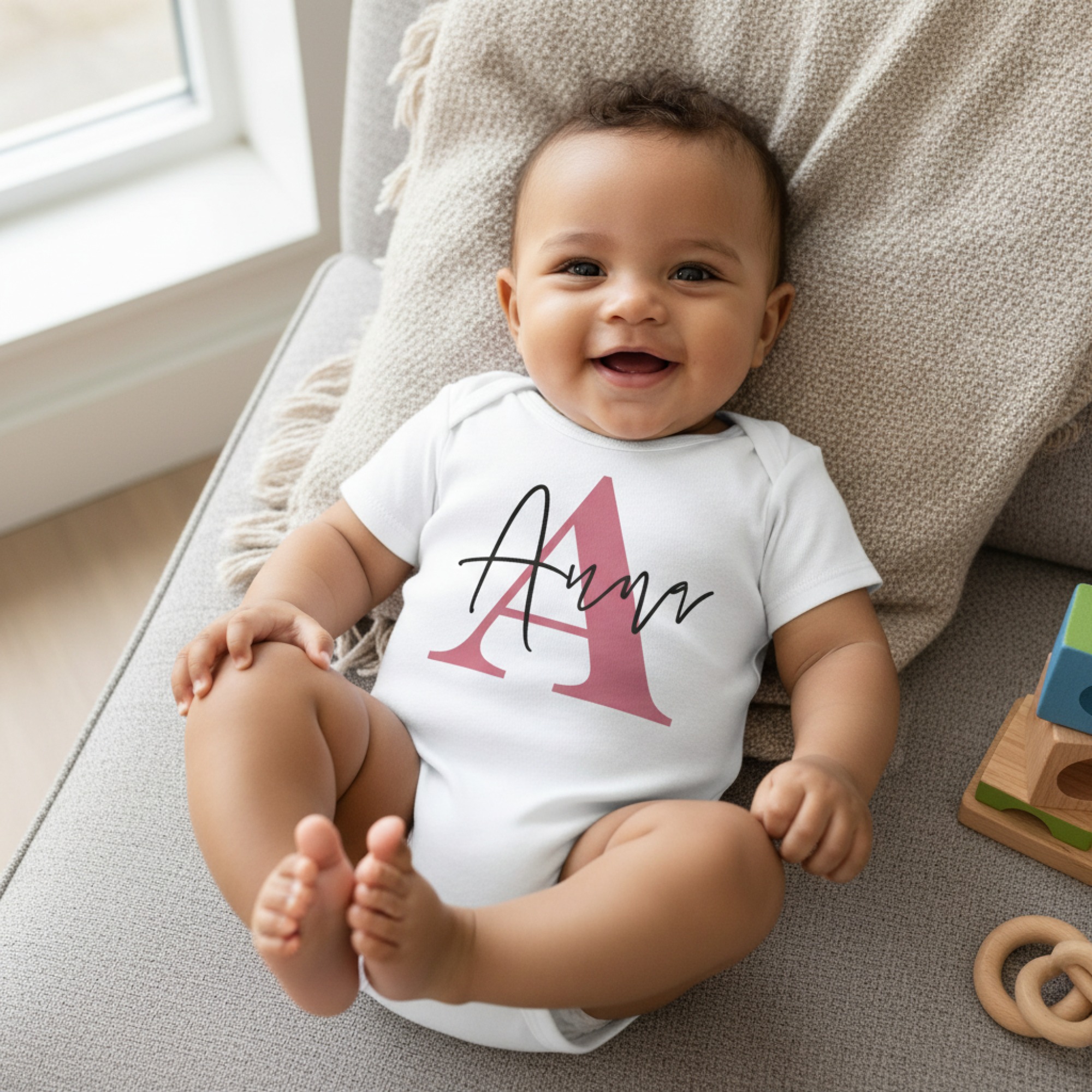 Rózsaszín kezdőbetűs gyerek body saját névvel
