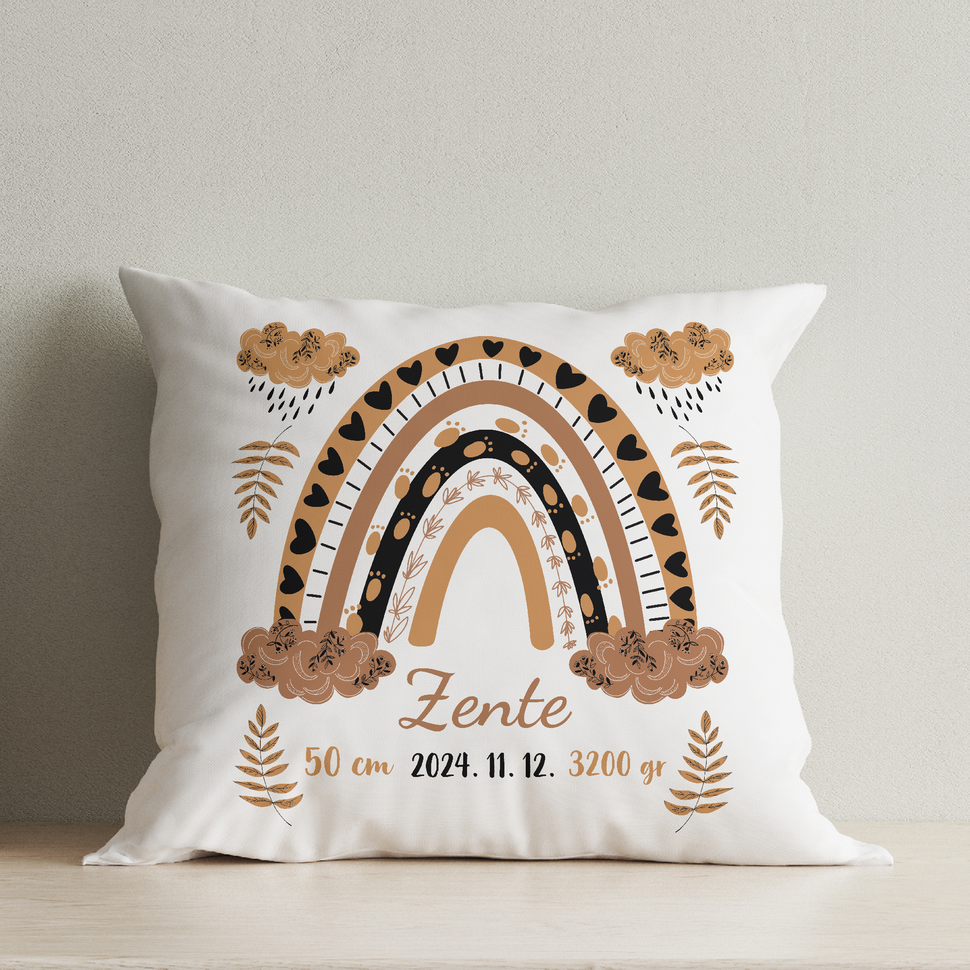 Szivárványmintás párna, gyermek nevével és születési adataival, barna árnyalatokkal