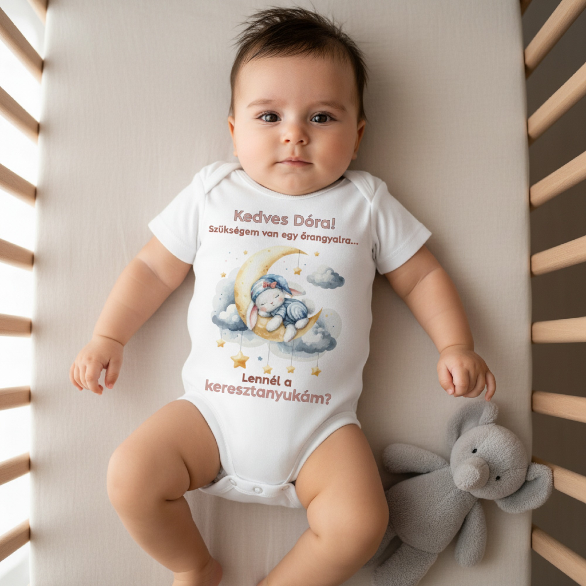 Szükségem van egy őrangyalra, lennél a keresztanyukám? rózsaszín szöveggel gyerek body, névvel
