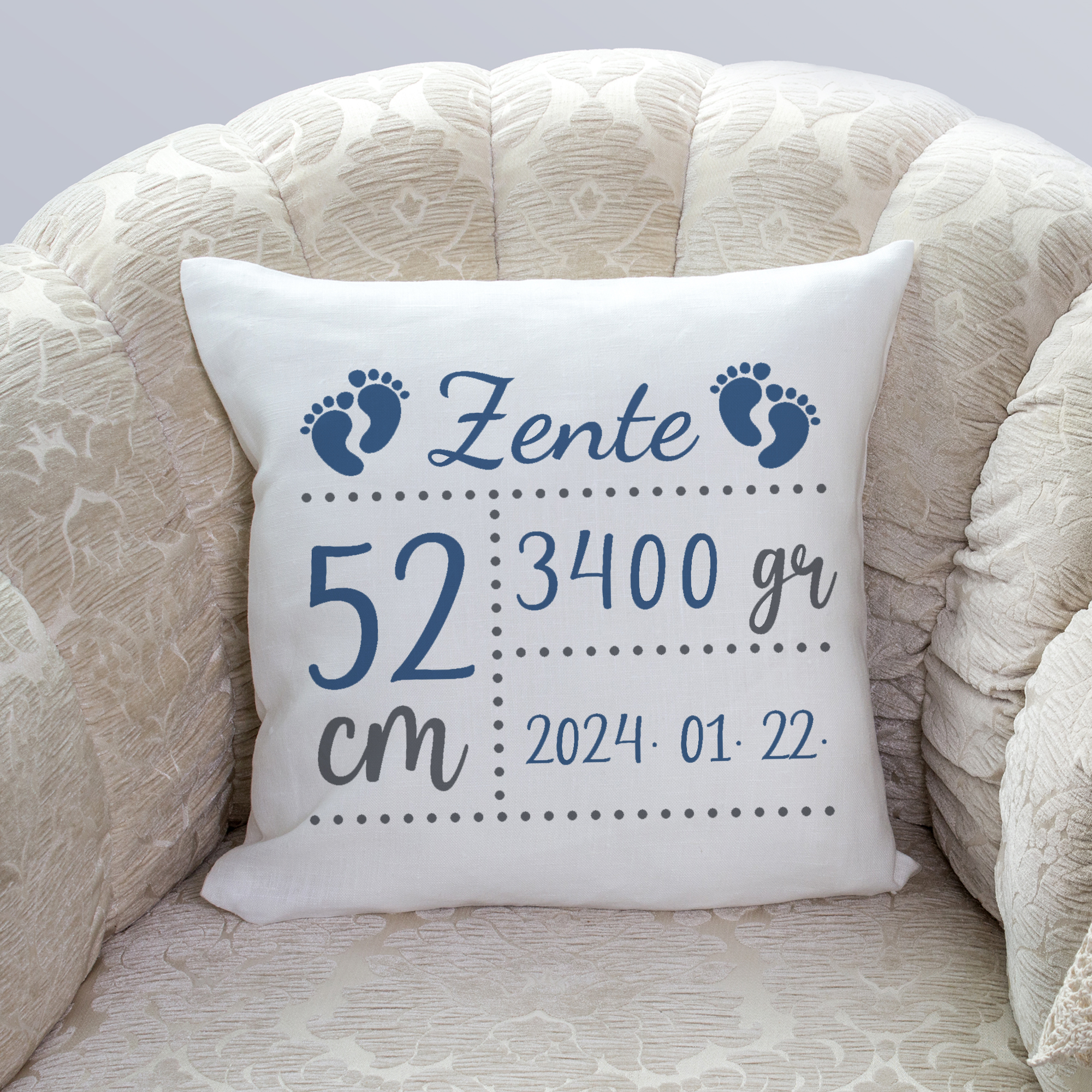 Talplenyomatos párna, gyermek nevével, születési adataival, kisfiúknak