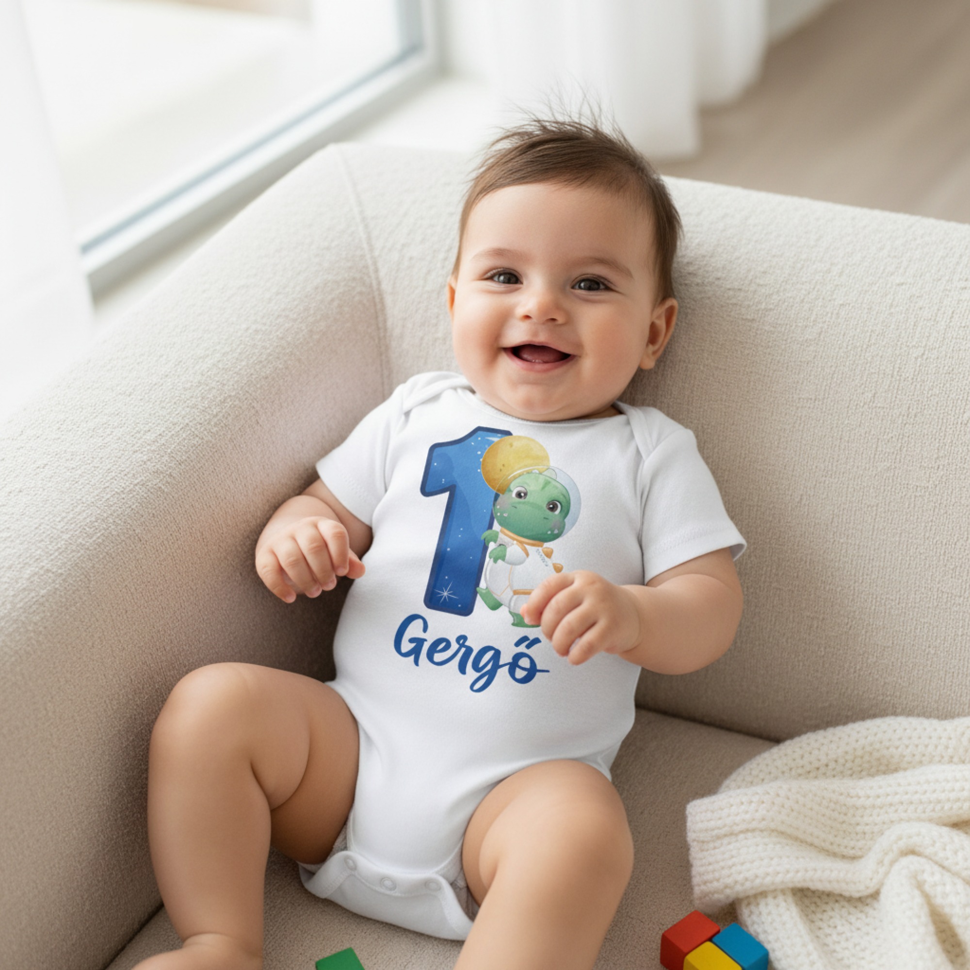 Űrhajós dínós első szülinapos gyerek body saját névvel