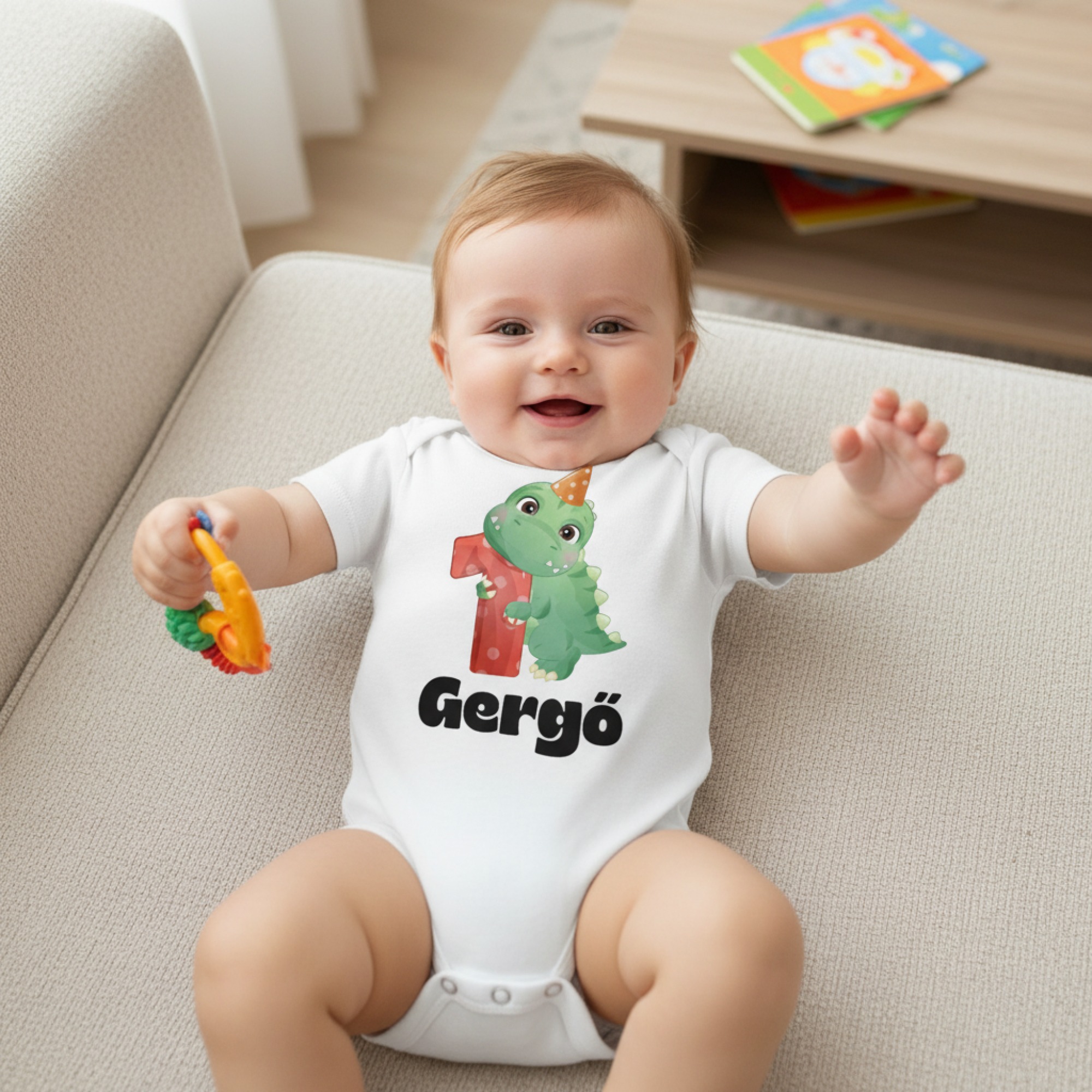 Zöld dínós első szülinapos gyerek body saját névvel