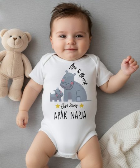 Első közös Apák napja, cuki vízilovakkal, névvel gyerek body