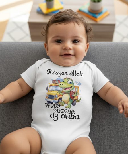 Készen állok, hogy zúzzak az oviba, vidám dínóval gyerek body