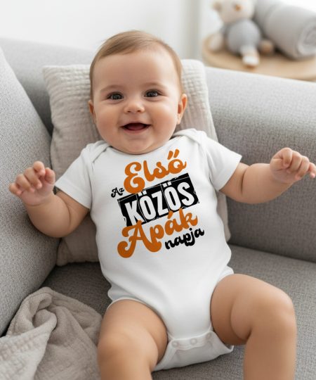 Az első közös apák napja fekete és narancs szöveggel gyerek body