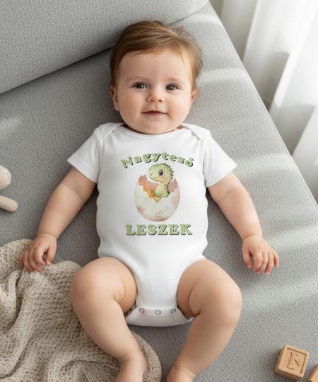 Masnis lila dínó kék tojásban gyerek body saját névvel