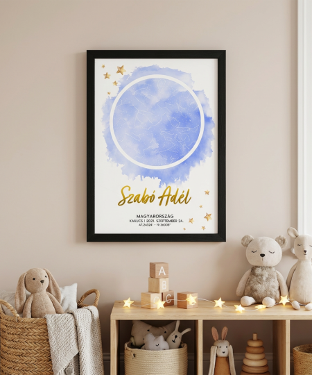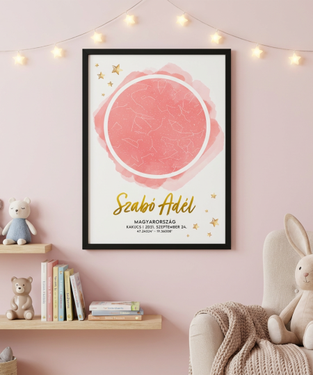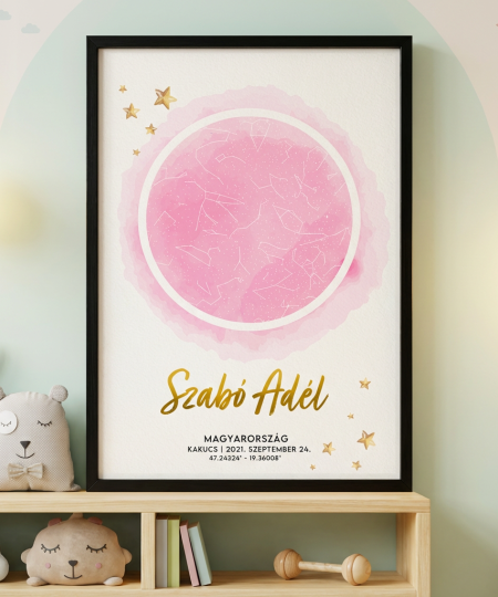 Születési poszter, kezekkel, fehér, vagy arany gyűrűvel, gyermek születési adataival, rózsaszín, vagy kék háttérrel