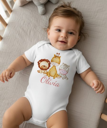 Szafari állatos gyerek body, rózsaszín névvel