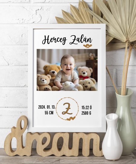 Születési poszter, kezdőbetűvel, gyermek nevével, adataival, fényképpel