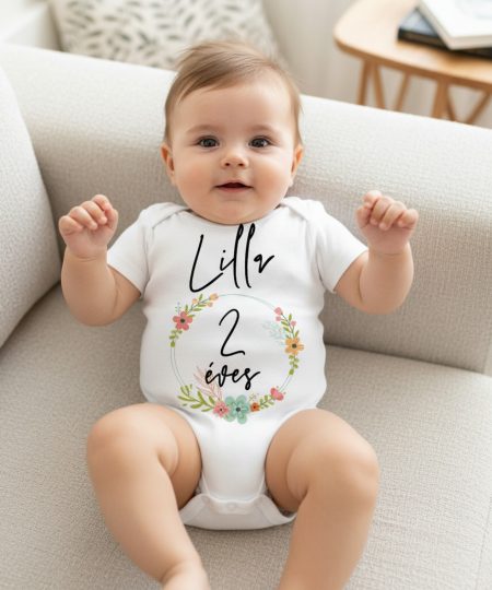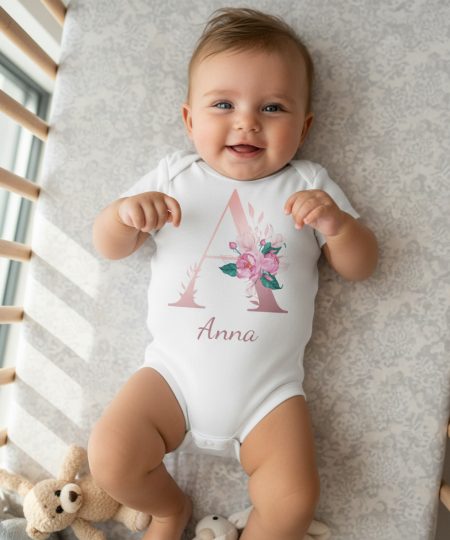 Virágos rózsaszín kezdőbetűs gyerek body saját névvel