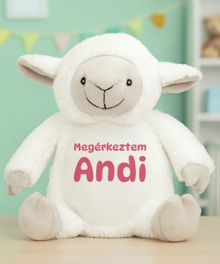 Megérkeztem névre szóló plüss bárány, választható színű szöveggel