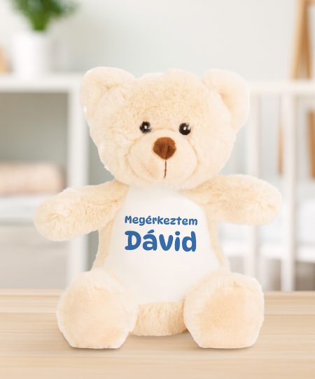 Plüss maci, névvel, születési adatokkal, választható színű szöveggel