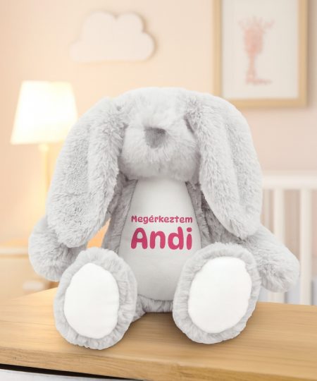 Plüss szürke nyuszi, névvel, születési adatokkal, választható színű szöveggel